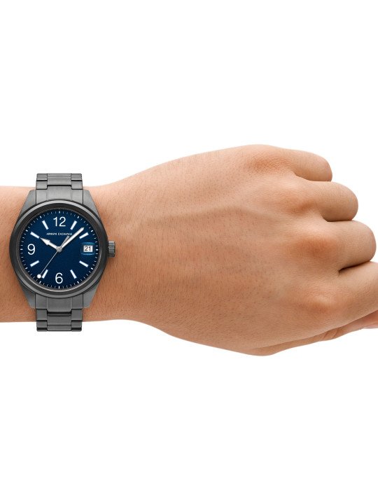 Elevate your everyday style with this striking timepiece from Armani Exchange, part of the “Kilian” collection. This watch features a sophisticated gunmetal grey stainless steel case and bracelet that provides a modern, industrial look. The design is anchored by a deep blue sandblast dial, which offers a subtle yet elegant contrast against the dark metal tones. Equipped with a precise quartz movement, the dial includes a practical date window and clean stick indices for easy readability. The robust bracelet is secured with a fold-over deployment clasp, ensuring a comfortable and secure fit for any occasion, from business meetings to casual outings.
