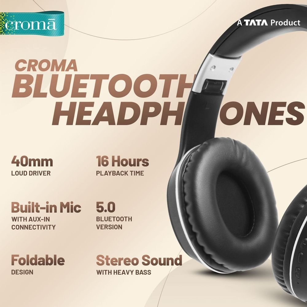 Croma Bluetooth Headphone with Mic (Up to 16 Hours Playback, On Ear, Black)