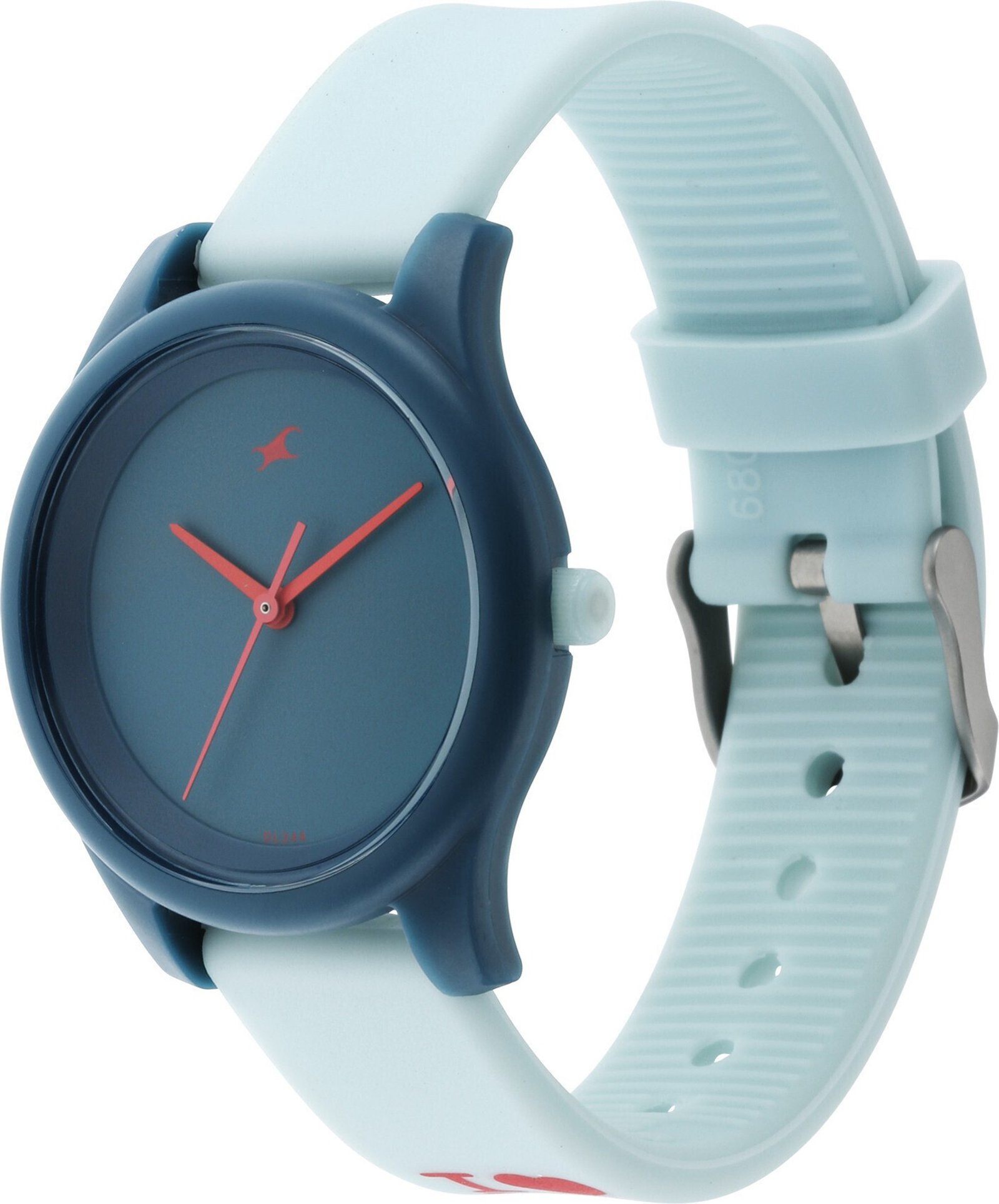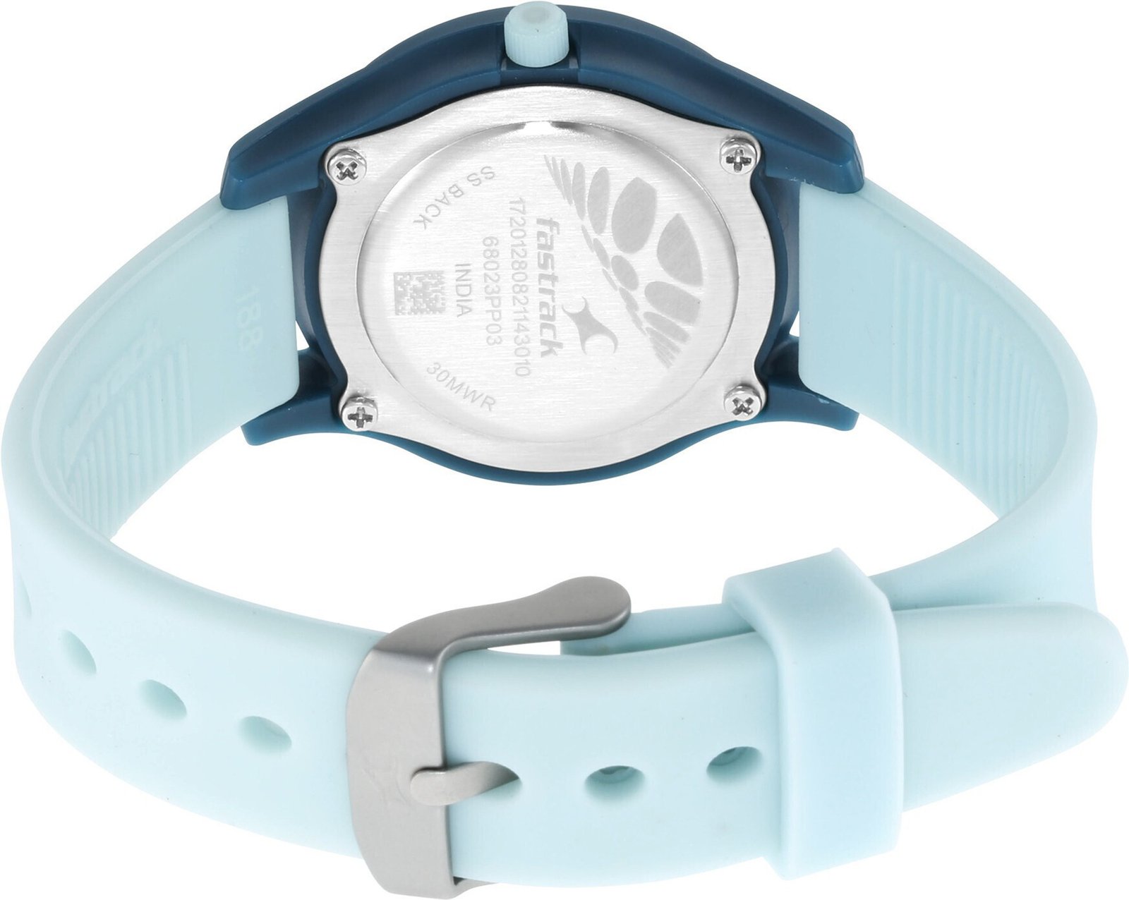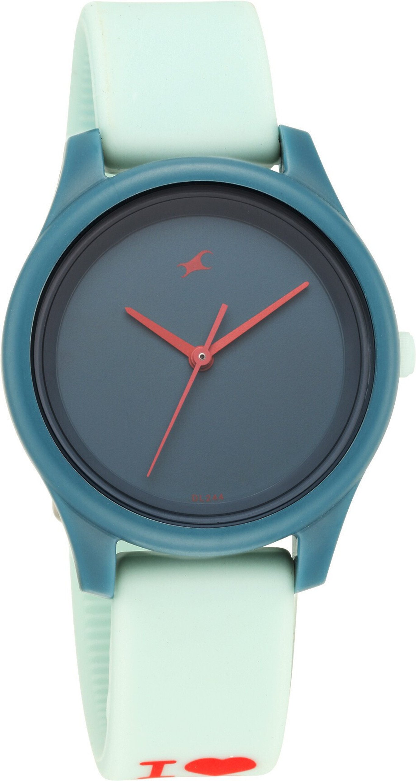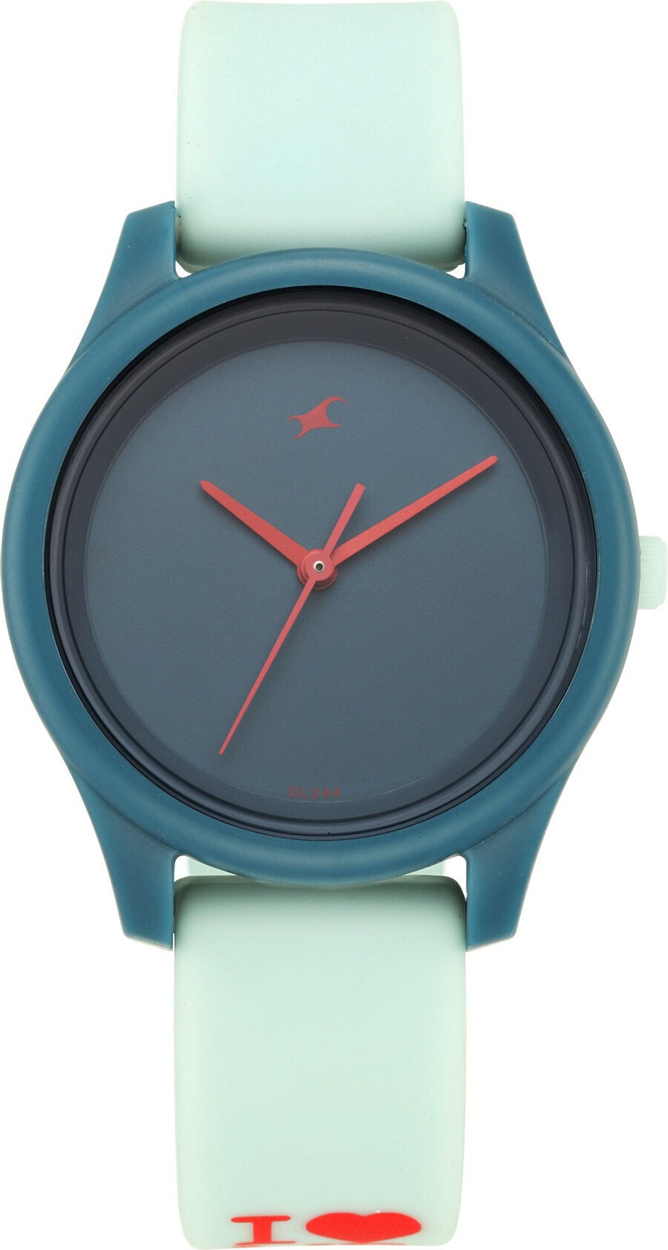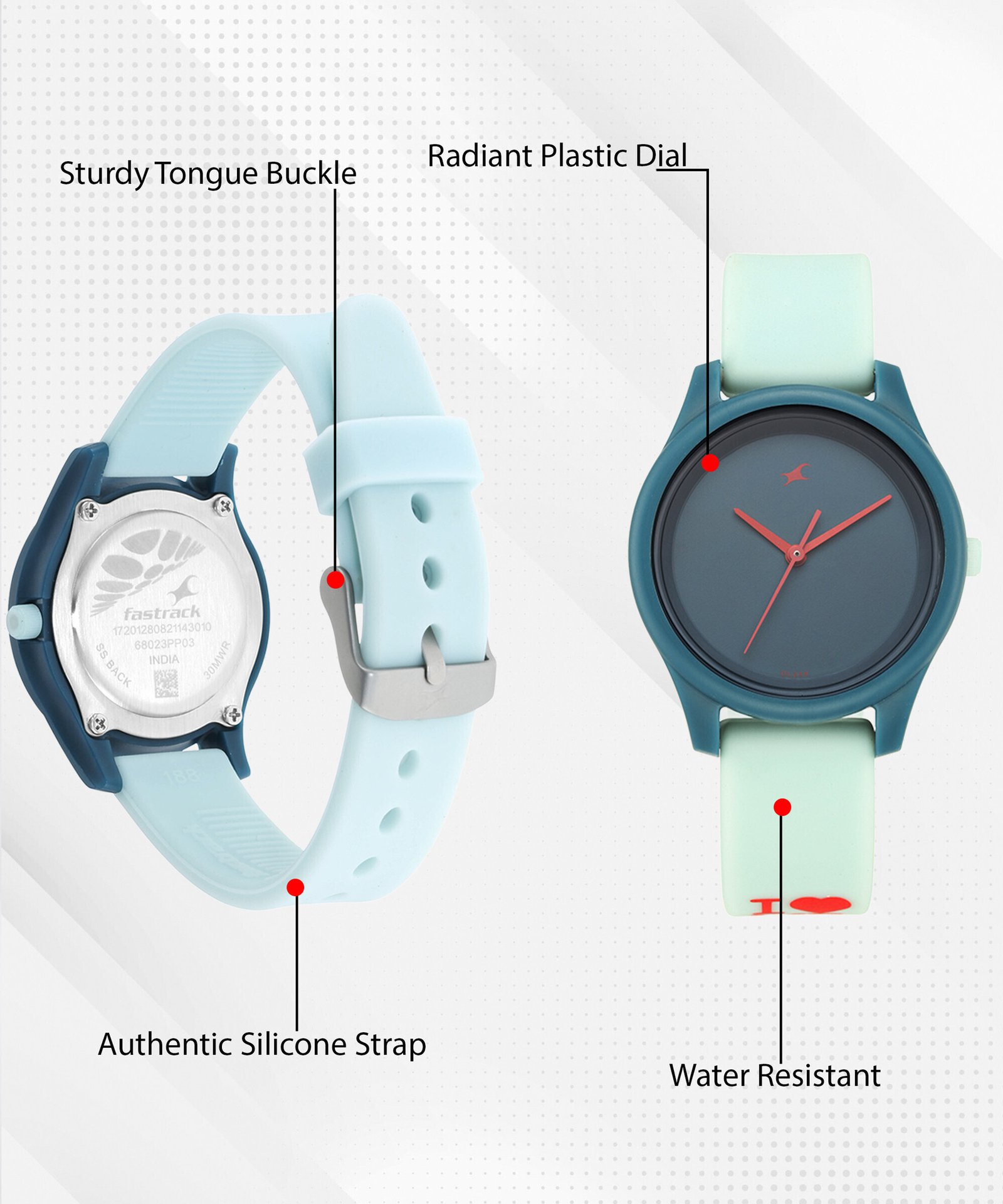 Add a pop of playful color to your daily look with the Fastrack Unisex Analog Watch (68023PP03W). Featuring a lightweight polycarbonate case in a bold teal finish, this watch houses a clean, minimalist dark dial accented by striking red hands. The ultra-comfortable mint green silicone strap adds a fun twist with its graphic details, making it the perfect casual accessory for college students, weekend outings, and those who love to express their vibrant personality.