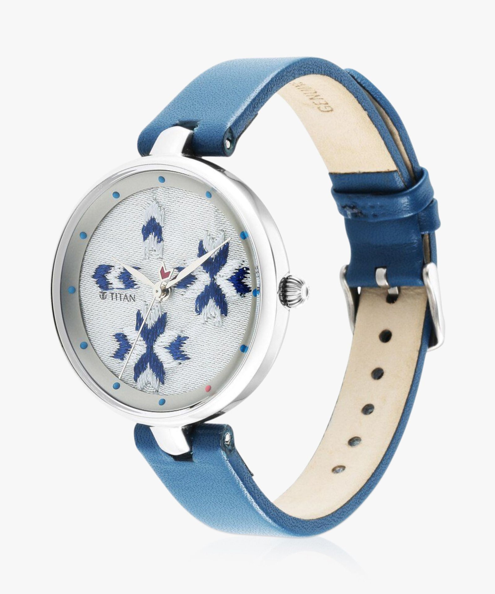 - Artisan-Inspired Dial: The centerpiece is a stunning white dial embellished with blue and pink floral embroidery, celebrating the heritage of Indian craftsmanship.